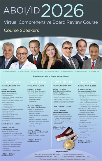 It should be noted that a three day review course is not intended to substitute for in-depth training in the discipline of oral implantology. The content of this program may prove to be helpful as an adjunct in preparation for written and oral examinations where a clinical and theoretical knowledge base in oral implantology is necessary.2026 Board Review Course Schedule